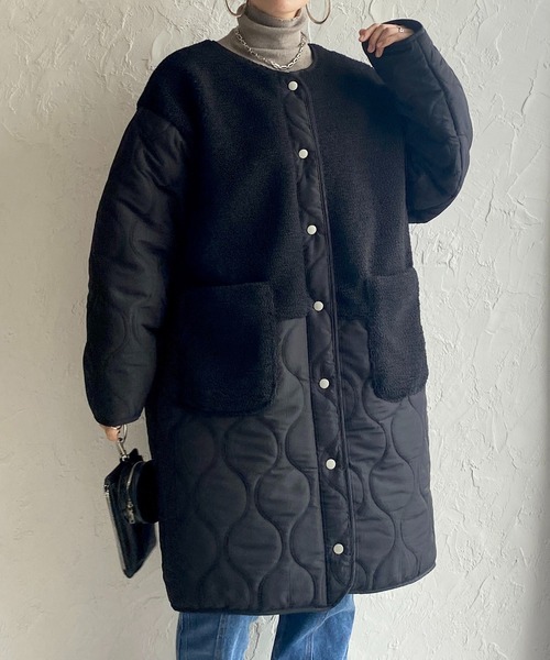 マットな品のある質感のキルティング素材と、ふわふわのボア素材を切り替えで配置した、切替ドッキングボアキルトコート。