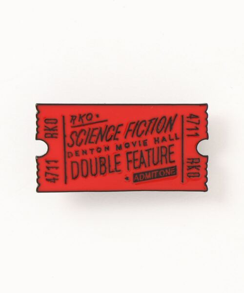 映画や飛行機のチケットがデザインされたピンバッジです。