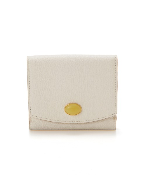 フラップのカーブラインが上品で穏やかな表情を作る二つ折りウォレット。一点一点表情の異なる立体的なプレシャスパーツが存在感を発揮し、モダンなワンポイントに。