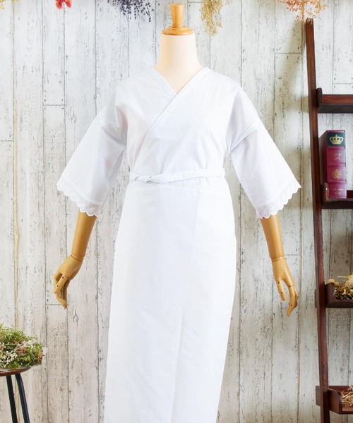 肌襦袢と裾除けが一体になった、スリップタイプの肌着です。お袖と裾には可愛らしい綿レースがついています。シンプルなのに多機能&オールシーズン使えて、着物の種類も選ばないので1枚持っておくと便利です。