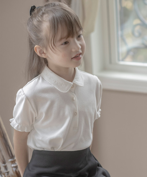 パフスリーブにピコレース、女の子デザインのブラウス襟元にリボン刺繍をトッピング。