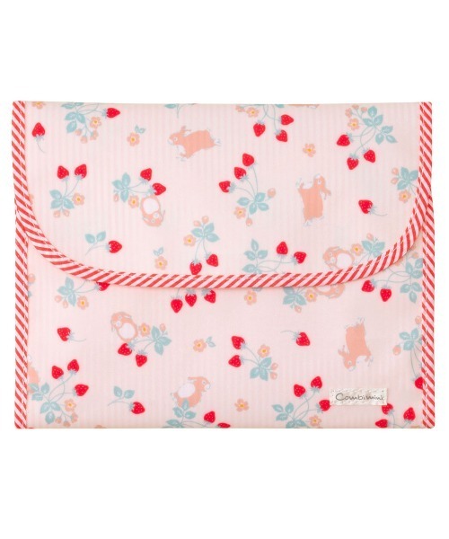 三角帽子をかぶった可愛らしいぞう柄と、キュートないちご&うさぎ柄の2柄から選べるおむつポーチ。片手でも開閉しやすいようにふたはワンタッチテープで留める仕様です。おしりふき収納ポケット付きで、おむつは4〜6枚程度入ります。