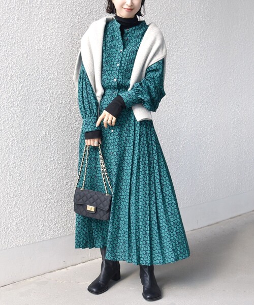 バンドカラーのサイドプリーツワンピースです。