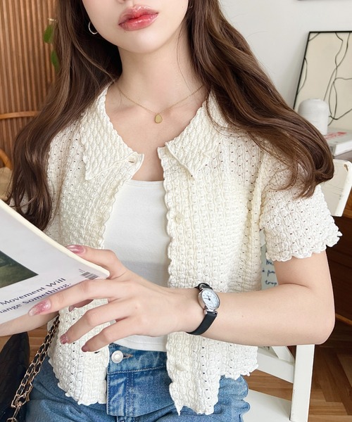・ぽこぽこワッシャーの素材感と各所に施したメロー仕様がレディライクな印象のシャツカーデ。