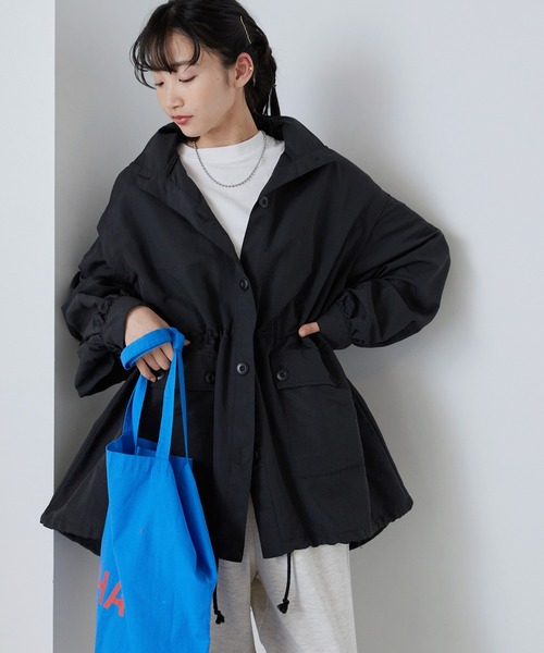 フードや大きめのポケット、フィッシュテールのミリタリーライクなディテールのなかに、ふんわりとしたボリュームスリーブで女性らしさをプラスしました。