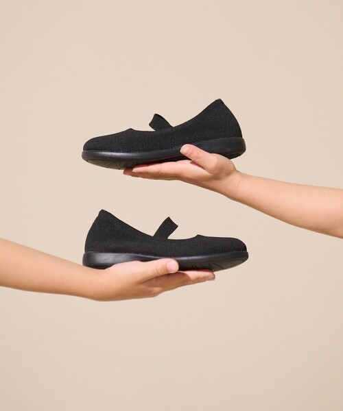使用済みペットボトルやプラスチック廃材をリサイクルしたポリエステルヤーンを使用。アウトソールも中敷きもリサイクル素材配合です。さらに、靴箱もなくすことで輸送におけるCO2排出を削減。サステイナブル素材を使用したショッパー(別売り)はなんと洗濯ネットとしても使える優れものです。