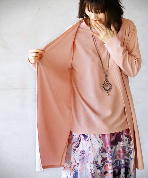 アンサンブルに見えて、実はインナーブラウスとトッパーカーデが一つになったドッキングデザイン。