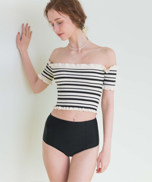 リブニット素材を使用したオフショルダーデザインのビキニ。おしゃれでありながら、気になる部分をさりげなくカバーできるデザインが魅力的です。