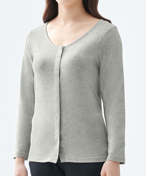 前開きインナーとして、日常的に着て頂くことはもちろん、診察時、入院時、授乳期、乳がん手術後、腕が上がりにくくなった時など様々な用途にお使い頂けます。