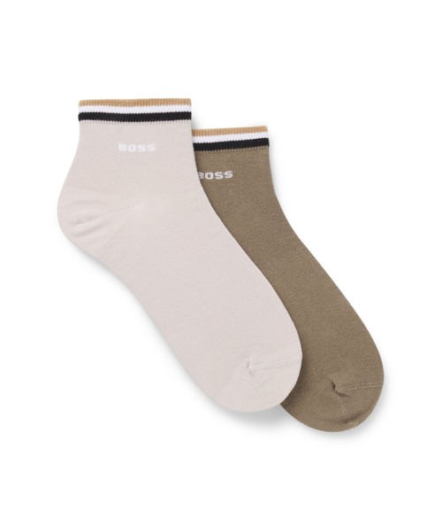 ストレッチを効かせたコットンブレンド糸で仕立てているショートソックス2足セット。このモダンな靴下の履き口部分にはシグネチャーストライプをあしらいました。配色使いのBOSSロゴをプラスしブランドDNAも感じられます。・カジュアル