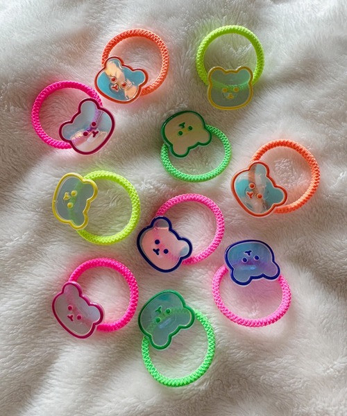 蛍光色のゴムと、ホロのように光の反射で色が変わるクマのプレートが可愛いヘアゴム。