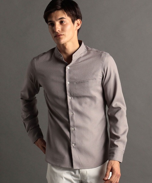 シャープな襟元を演出するバンドカラーシャツ。