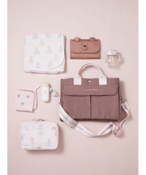 収納力に優れたONLINE限定のスクエア型ママバッグです。自立する本体は中身の量に合わせて使える上部ファスナー付きで、ママバッグ以外の用途にも幅広く使えるトート、ショルダーの2wayデザイン。前面のフラップポケットはマグネット式で小物が落ちにくくなっています。外ポケットと内ポケットが5つずつ、さらに底面にも汚れ物などを入れられるポケットが付いており、収納力は抜群。全体的にはシンプルな色合いですが、裏地のチェリー柄にちょっぴりテンションが上がります。色はベージュとブラウンの2色展開でご用意しました。