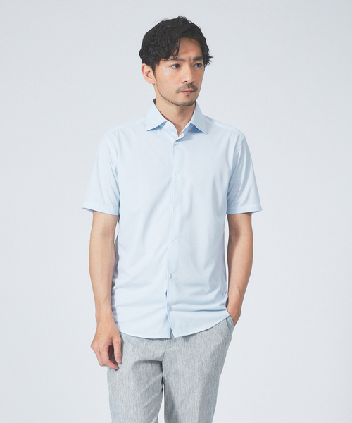 【素材】織物のようなハリコシのあるトリコットジャージで、生地の染色・編みたては国内生産。ストレッチ性に優れ、非常に動きやすく、通気性は織物の3倍以上でムレにくく、快適性に優れています。また、防シワ性に優れ、シワになりくいイージーケア素材でもあります。速乾性にも優れ、洗濯後すぐに乾きやすく、5R加工(ソイルリリース加工)付きで汚れが落ちやすい素材です。