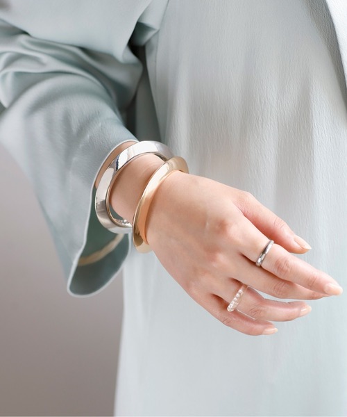シャープなフォルムとメタルの輝きが、クールな印象を与えてくれるバングル。