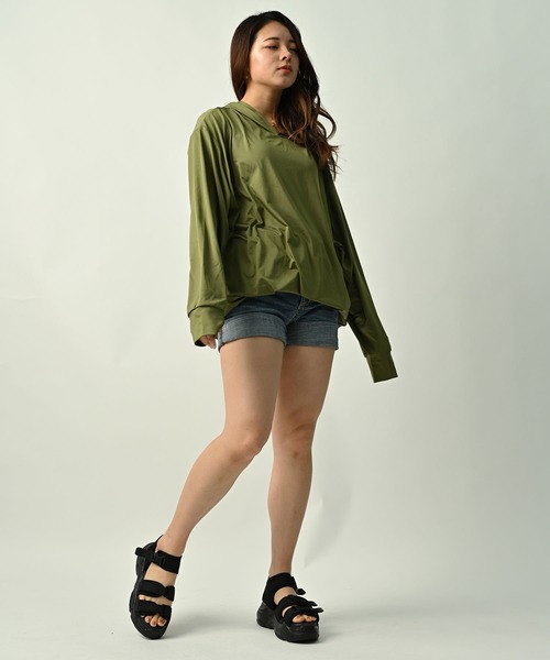 親指が通せるフィンガーホール付き。フード有り、ポケット無し