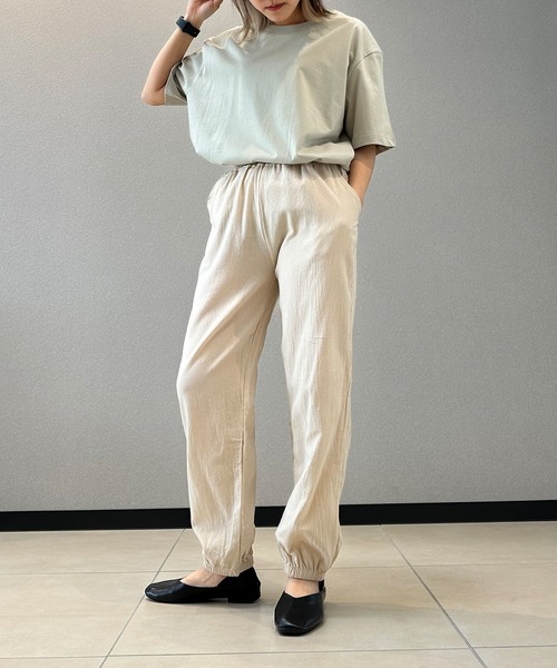 コットンとポリエステルの素材を使用しているワイドパンツです。ハーフパンツのような丈感で、膝下から足首を覆うほどの丈が特徴です。ゆったりとしたシルエットで着心地が良く、通気性が高いため夏場にも着用しやすいです。また、リネン素材を使用したワイドパンツよりもシワになりにくく、お手入れも簡単です。リラックス感があるのに上品な印象を与えることができます。トップスは、Tシャツやシャツ、ブラウスなど様々なものと合わせて、カジュアルに着こなすことができます。足元にはスニーカーやサンダル、ミュールなどを合わせて、軽やかな印象に仕上げるのが楽しめます。
