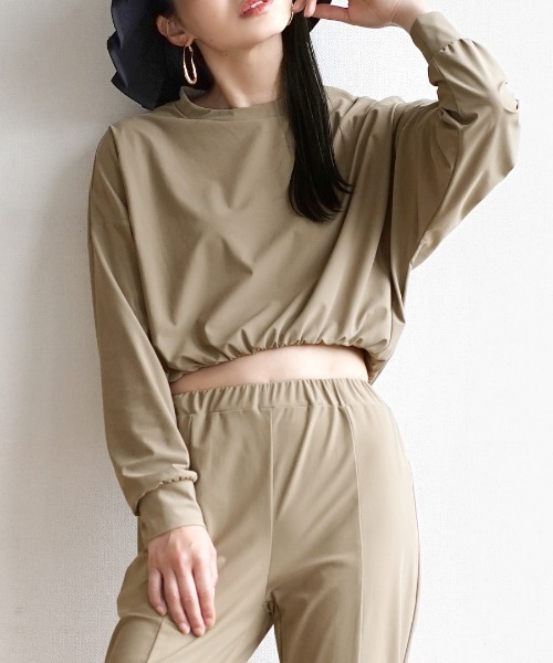 トレンドライクなシルエットのショート丈プルオーバー身幅はゆったりワイドに、さらに裾がゴムでシェイプされたメリハリのある細見えシルエット。