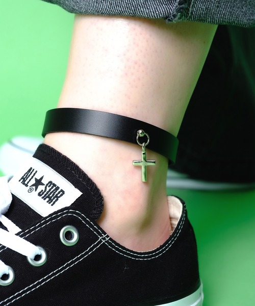 足元のアクセサリーとして定番のレザーアンクレット。やや太めの上品な革のバックルベルト仕様がスタイリッシュ。