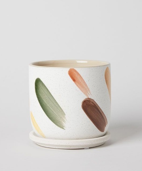 砂のような表情のある質感に、カラフルなペイントが施されたポット。リズミカルな模様がグリーンに映え、空間を明るく楽し気な雰囲気にします。デザイン性の高いポットは、個性的な植物と組み合わせると遊び心が感じられ、より魅力が引き立ちます。