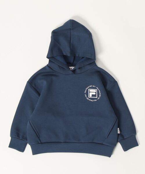FILAのキッズフード付トレーナーです!左胸にFILAのロゴプリントが入っているシンプルなデザインです。