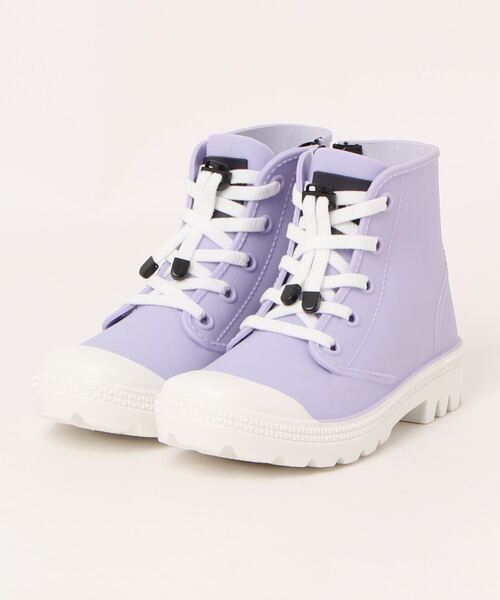 PVC素材の防水ジュニアレインスニーカー。甲のシューレースはゴム紐で伸び伸び、内側ファスナー仕様で脱ぎ履きもラクチン!シンプルなデザインで雨が上がった後もオシャレな一足です。