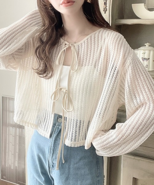・ちらっと覗く程よい肌見せと、リボンデザインが大人可愛い前後2WAYストライプメッシュカーディガン。