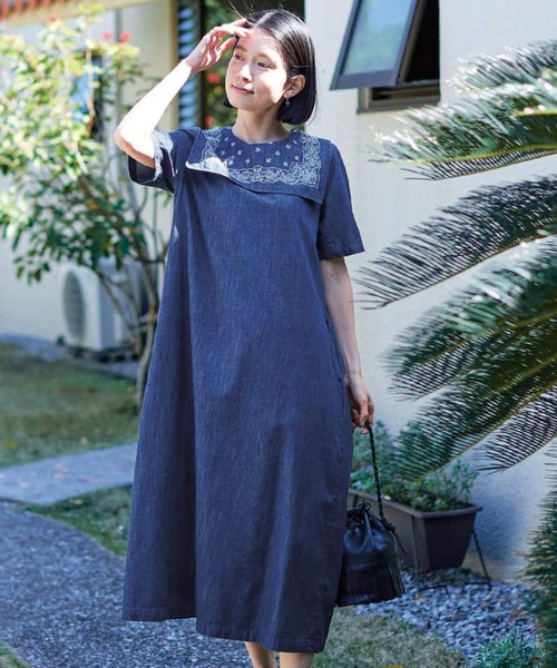 ライトオンスのデニム地を使って仕立てました。四角いブザムのような衿を前後に付け、ペイズリー模様のバンダナ柄を刺しゅうしています。