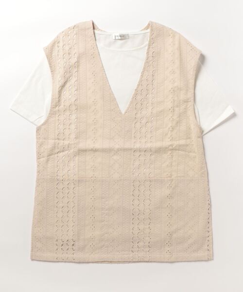ほのかな透け感のレースベストとシンプルなプルオーバーのセットで夏コーデが即キマる。
