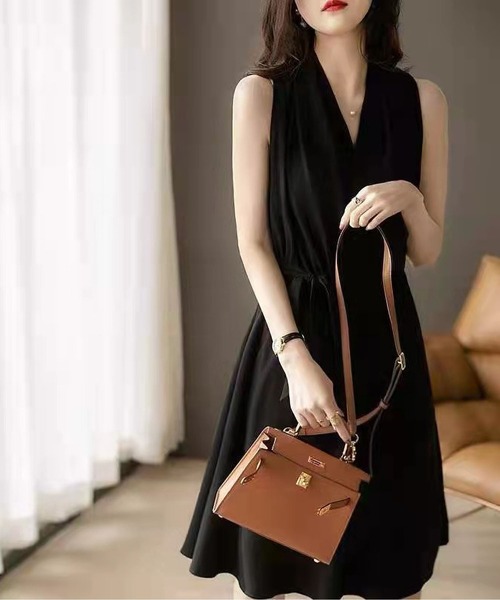 Vネックノースリーブデザインの大人シルエットのワンピース