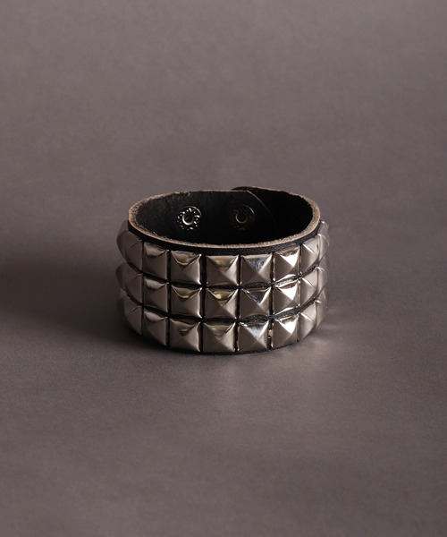 ピラミッドスタッズやチェーン、ハートチェーンや丸スタッズが鈍く光るフェイクレザーブレスレット
