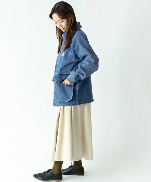 金茶のステッチとロゴ刺繍が目を引くデニムカバーオール。