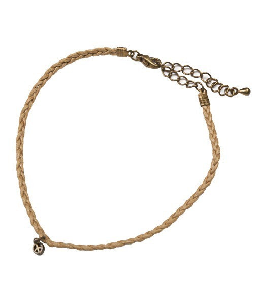 麻紐風の三つ編みロープにピースマークのモチーフチャームを付けたアンクレットの登場。