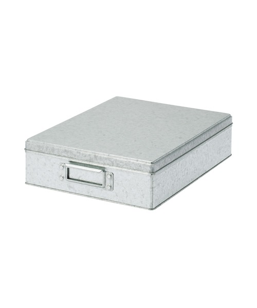 商品サイズ:約幅26×奥行34×高さ8.5cm 建築材料として使われる錆びにくく丈夫なトタンを使用しました。積み重ねてもズレにくい仕様で棚置きでもスペースを有効に使うことができます。外から中身がわかるよう持ち手部分に印を付けれるようにしました。