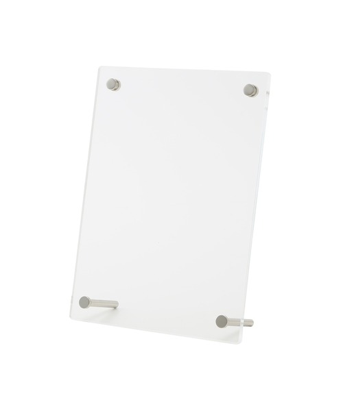 2枚のアクリル板を使ったシンプルな構造のハガキサイズ用フォトフレームです。脚の取付け方で、縦置き・横置きどちらでも使用できます。