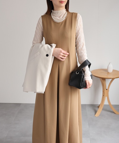 ロングワンピースで切り替えがある分、ウエストマークされているのでカジュアルにまとめて可愛く決まる◎