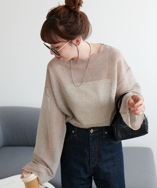 抜け感のあるコーディネートを演出するシアーボーダーTシャツ透け感とピッチの細いボーダーがこなれた印象のトップス。