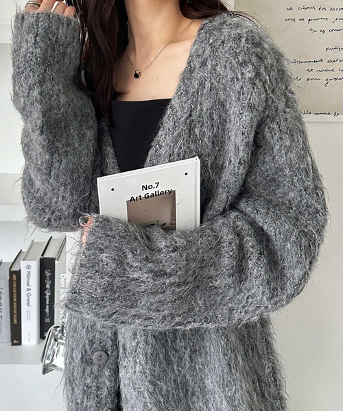 ふんわりとした毛並みでボリューム感があり、1枚で華やかに決まるニットカーディガン。