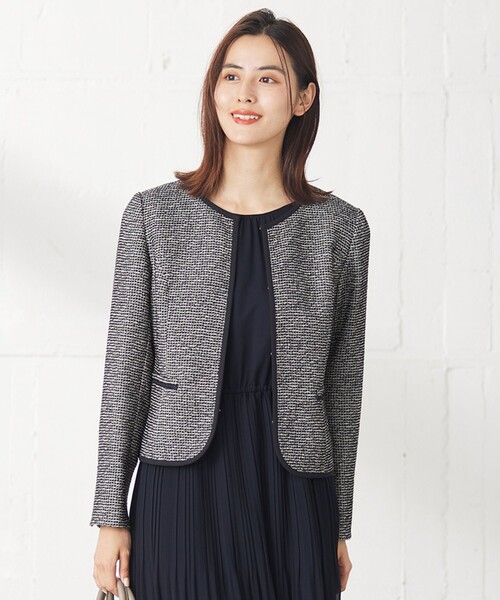 女性らしさを引き立たせるデザインノーカラージャケットです。パイピングでメリハリをつけたデザインがポイント。ストレッチがきいた裏地を使用しており、着心地の良さも魅力の一つ。コンパクトな丈感ですので、ワンピースやスカート幅広いボトムスと好相性です。さりげないポケット口のブレード装飾が控えめでフェミニンさをプラス。袖周りは少しゆとりを持たせているので、インナー選びもしやすい羽織になっています。セレモニーシーンや通勤シーンにおすすめです。
