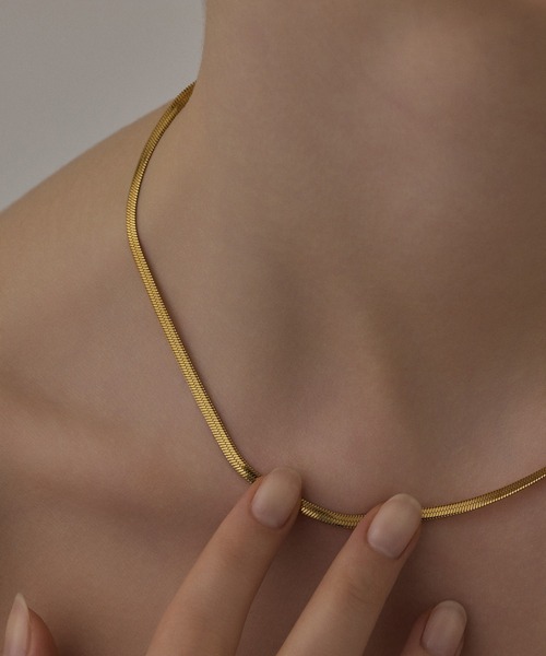 トレンドの3mmのスネークチェーンを使った 繊細な加工した上品なゴールドネックレス。シンプルなデザインで無駄がなく 年齢を選ばずひとつは持っておきたい定番アイテムです。