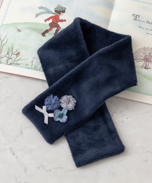 あったか冬の必須アイテムのマフラー。もこもこのマフラーに花とリボンをちりばめました。