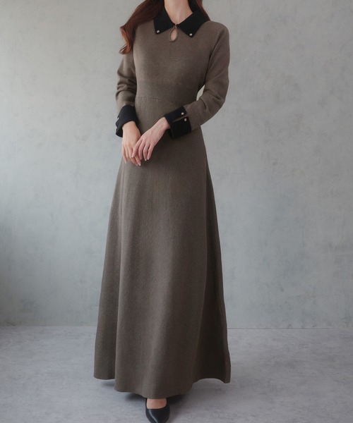 袖口と襟の配色デザインがおしゃれなワンピ。
