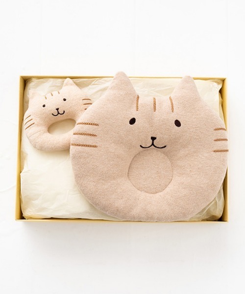 かわいいにゃんこのキャラクターで「絶壁」の予防が期待できるベビー枕、ガラガラの2点セット。