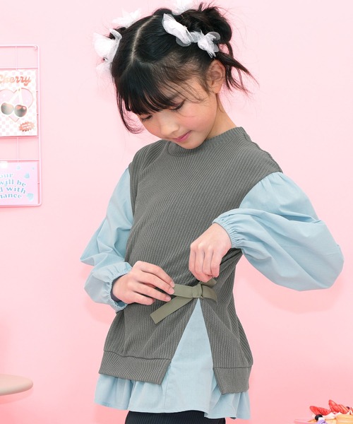 サイドリボンで女の子らしさを演出し、ベストとシャツのドッキングでキレイめコーデにもピッタリです。
