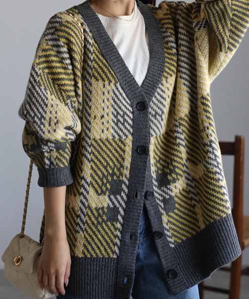 配色ジャガードチェックカーディガン