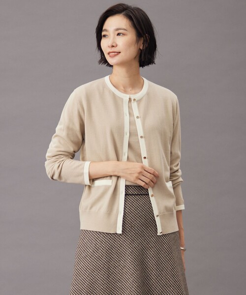 シンプルなメタル釦が上品なクルーネックのアンサンブルニット。なじみの良いバイカラーで効かせた配色ラインがクラシカルな印象に。ツインセットでもカーディガン、インナーそれぞれ単品でもコーディネートのアクセントになり、きれいめお出かけスタイルやオフィスシーンに活躍してくれます。