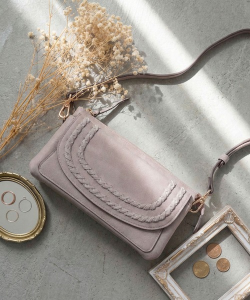 かがり編みのアクセントが印象的な横長のウォレットクロスボディバッグです。