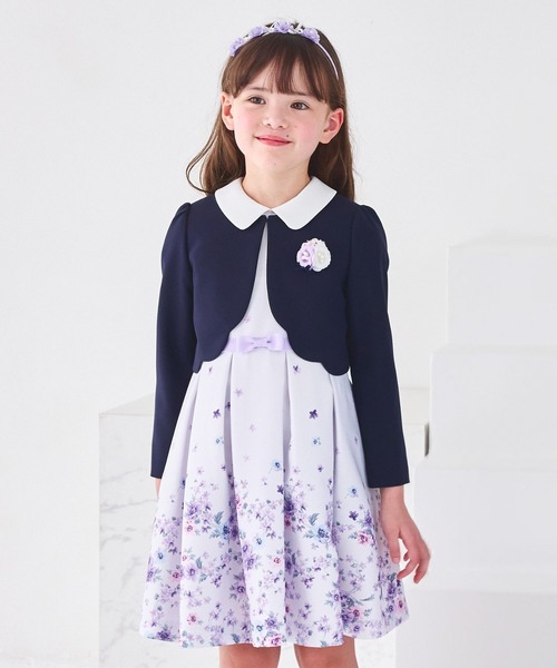 ジャケットの前身頃にはお花をイメージしたスカラップデザインを使用し、ワンピースは1枚でも様になるフラワープリントを主役に、ウエストにはパープルのグログランテープでアクセント。