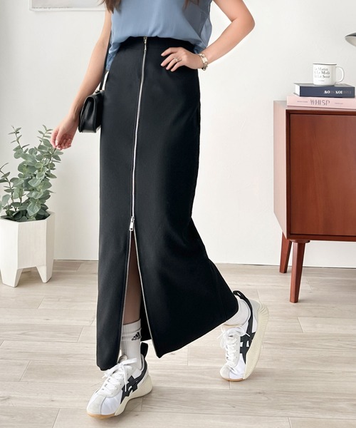 ベーシックなシルエットのスカートに、トレンド感のあるファスナー使いがポイント。