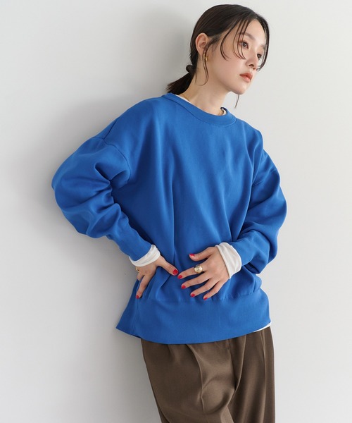 ボリュームがありスウェット見えする生地感で、もっちりとした編み地がカジュアルな一枚です。